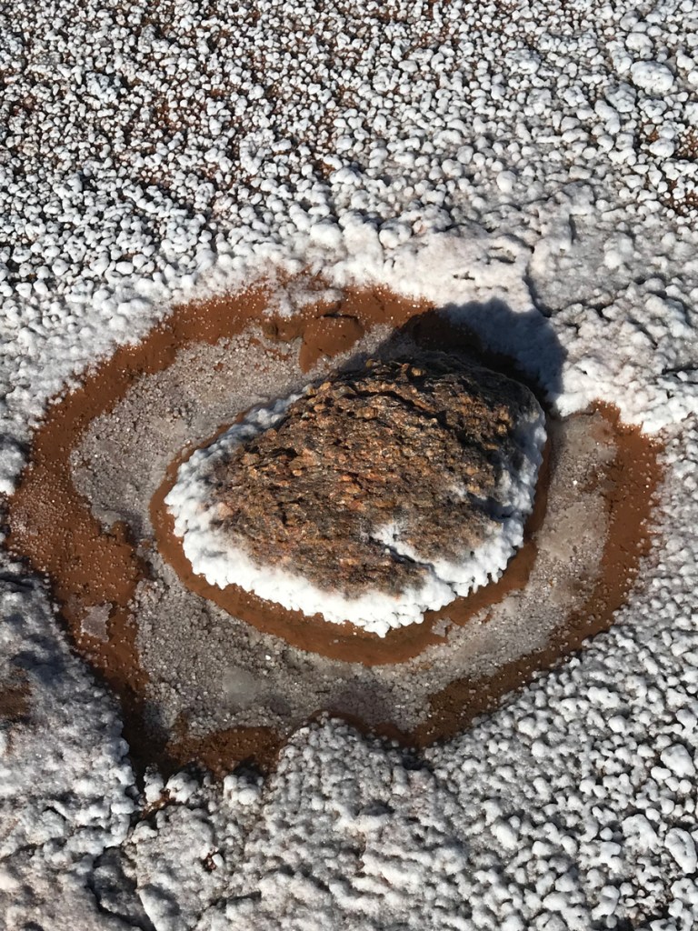 The area looks almost moon-like in places, with rocks covering the white surface. The salt eats at them, pitting some in almost coral patterns.
